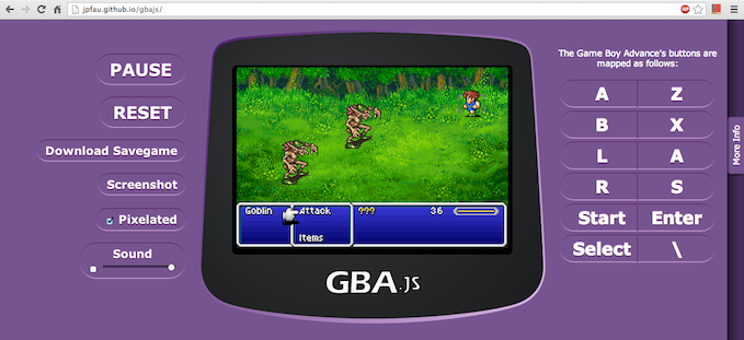 Un emulateur Gameboy Advance pour jouer en ligne depuis votre navigateur. Il est plus rapide sur Chrome ou safari et compatible avec Opera, Firefox et internet Explorer. Aucune ROM n'est fournie, il faut charger les ROM directement depuis l'interface prévue à cet effet.